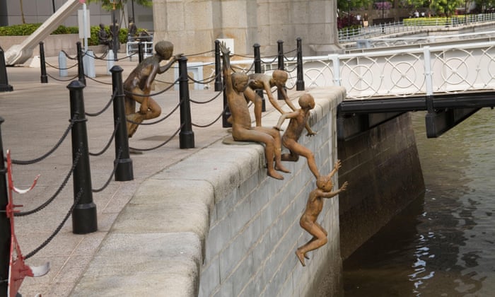 "PRIMERA GENERACIÓN" es una de las obras que se realizo en el año 2000, esta escultura representa a un grupo de niños desnudos saltando al Río Singapur.